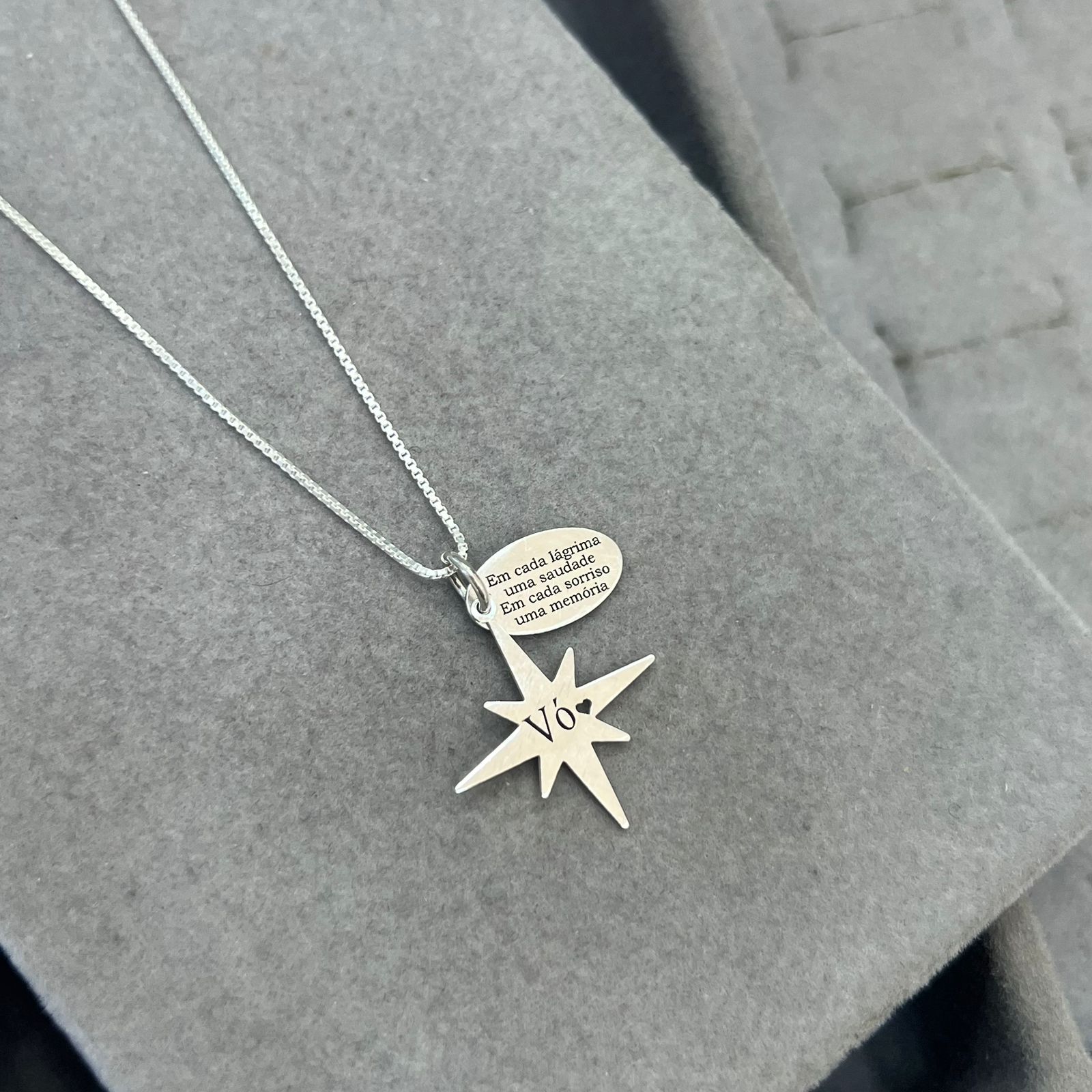 O Pingente Estrela da Saudade com Nome é uma joia carregada de significado, criada para eternizar lembranças e manter viva a conexão com quem mora para sempre no coração. A estrela simboliza luz, proteção e presença, representando aqueles que continuam iluminando nossos caminhos, mesmo à distância.